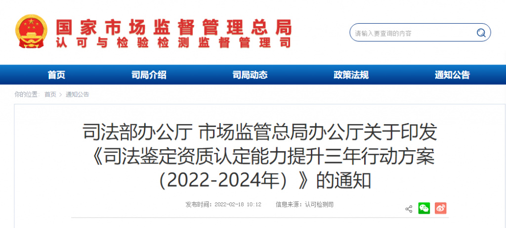 司法部办公厅 市场监管总局办公厅关于印发《司法鉴定资质认定能力提升三年行动方案(2022-2024年)》的通知