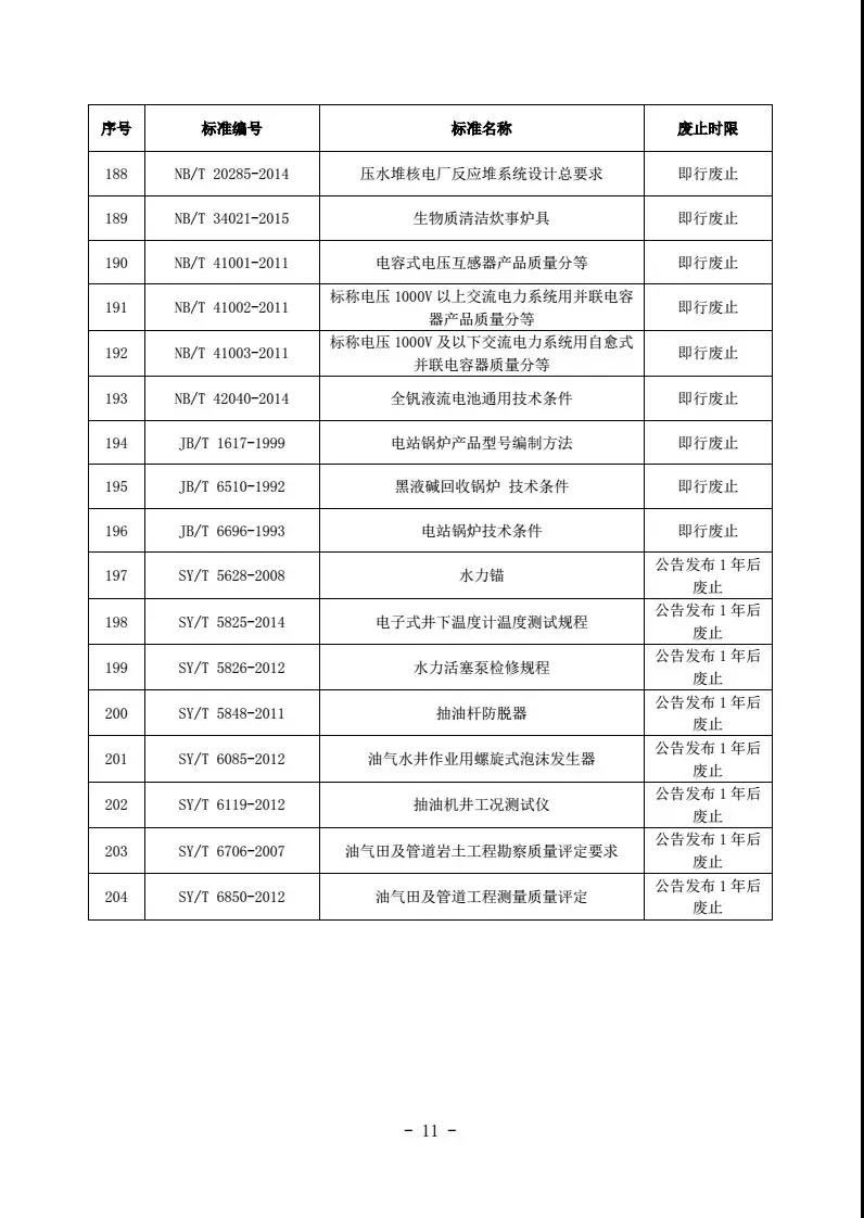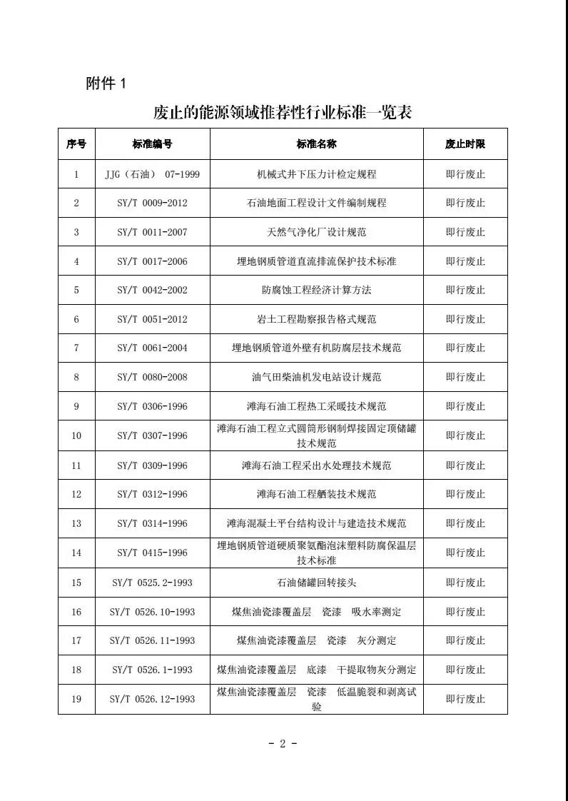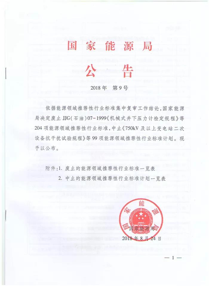 近日能源局公布了2018年第9号文件,宣布废止一批能源领域推荐性行业标准和中止一批能源领域推荐性行业标准计划。内容包括了JJG(石油)07- 1999《机械式井下压力计检定规程》等204项能源领域推荐性行业标准,中止《750kV及以上变电站二次设备抗干扰试验规程》等99项能源领域推荐性行业标准计划。