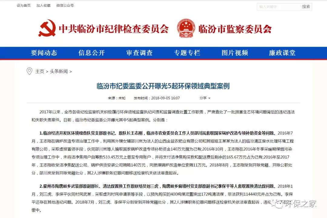 1.临汾经济开发区环境稽查队党支部原书记、原队长王志刚,临汾市农业委员会工作人员邵川岚套取国家锅炉改造专项补助资金等问题。2016年7月,王志刚在锅炉改造专项治理工作中,利用其外甥女婿邵川岚为法人的山西金益农肥业有限公司和其姐姐王某某为法人的临汾清正废水处理环境工程有限公司,采取虚报冒领手段,伙同邵川岚等人骗取国家锅炉改造专项补助资金140万元据为己有;2016年10月,王志刚在2016年冬季采暖期煤烟污染专项治理工作中,未将洁净焦用户自筹款533.45万元上缴至专用账户,并将支付洁净焦购买款和配送费后剩余的165.67万元占为己有;2016年至2017年,王志刚收受洁净焦配送公司、锅炉供货安装公司贿赂140万元,向燃煤锅炉改造单位索贿11万元。2018年8月,王志刚受到开除党籍、开除公职处分,邵川岚受到开除党籍处分,其2人涉嫌职务犯罪问题移送检察机关依法审查起诉。