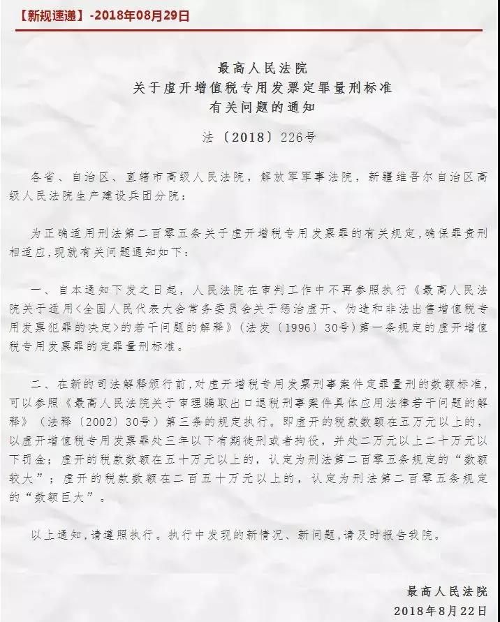 2018年8月22日 ,最高人民法院发布了关于虚开增值税专用发票定罪量刑标准有关问题的通知。通知如下: