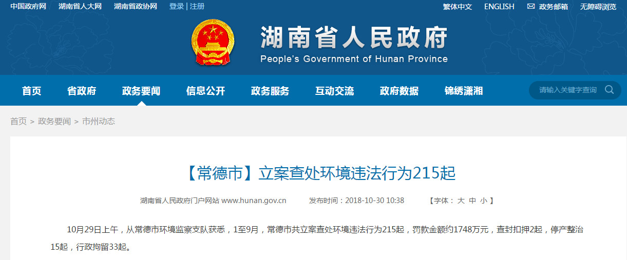 10月29日上午,从常德市环境监察支队获悉,1至9月,常德市共立案查处环境违法行为215起,罚款金额约1748万元,查封扣押2起,停产整治15起,行政拘留33起。