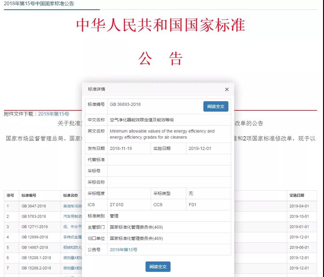 2018年第15号中国国家标准公告,批准发布《汽车用制动器衬片》等27项国家标准和2项国家标准修改单。其中,包括社会关注的《空气净化器能效限定值及能效等级》GB 36893-2018。