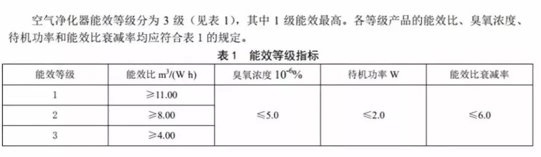 标准对空气净化器的能效限定值及能效等级进行了规定,标准生效后将替换现行的国家推荐性标准GB/T 18801-2015 《空气净化器》中的能效限定值及能效等级要求。自2019年12月1日起,中国国内市场上销售的空气净化器的能效限定值与能效等级将需要符合如下的规定: