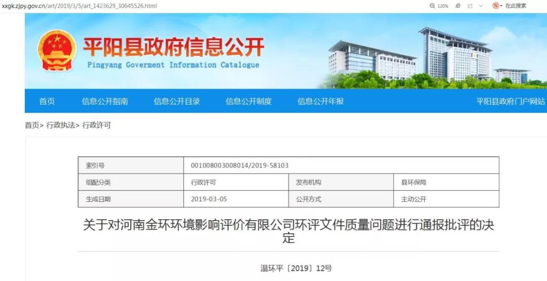 根据《浙江省环境影响评价机构信用等级管理办法》(浙环发〔2019〕3号)、《关于进一步加强环境影响评价机构日常监督考核的通知》(温环函〔2017〕43号)、《平阳县环境影响评价机构管理考核办法(试行)》(平环〔2017〕75号)等文件规定,该环评报告质量不合格,违反《温州市环境影响评价从业行为规范负面清单》。经我局研究决定,对你公司进行通报批评,你公司2019年3月份及第一季度环评单位考核结果为不合格,并对你公司在平阳县业务负责人进行约谈。