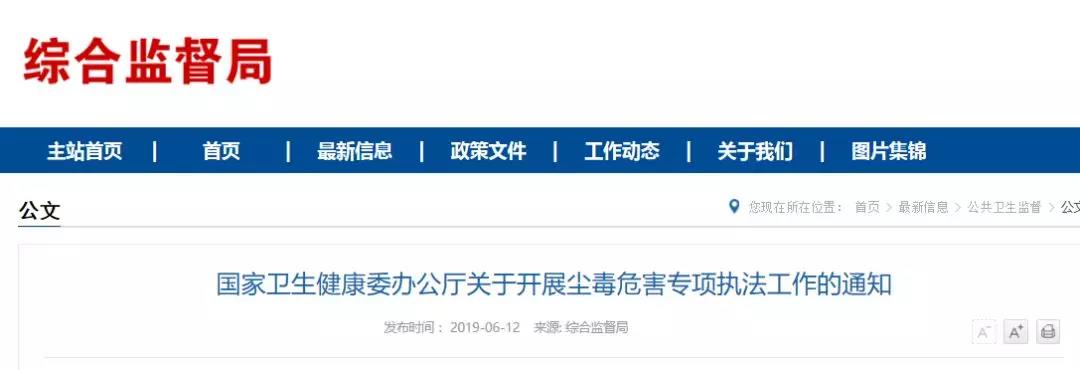 为贯彻落实《国家职业病防治规划(2016-2020 年)》,确保《国家卫生健康委办公厅关于在矿山、冶金和化工等重点行业领域开展尘毒危害治理工作的通知》(国卫办职健函〔2019〕406号,以下简称406号文件)取得实效,决定在矿山、冶金、建材、化工等重点行业领域开展尘毒危害专项执法工作。现就有关事项通知如下。