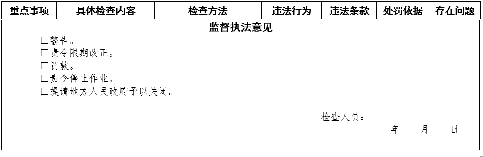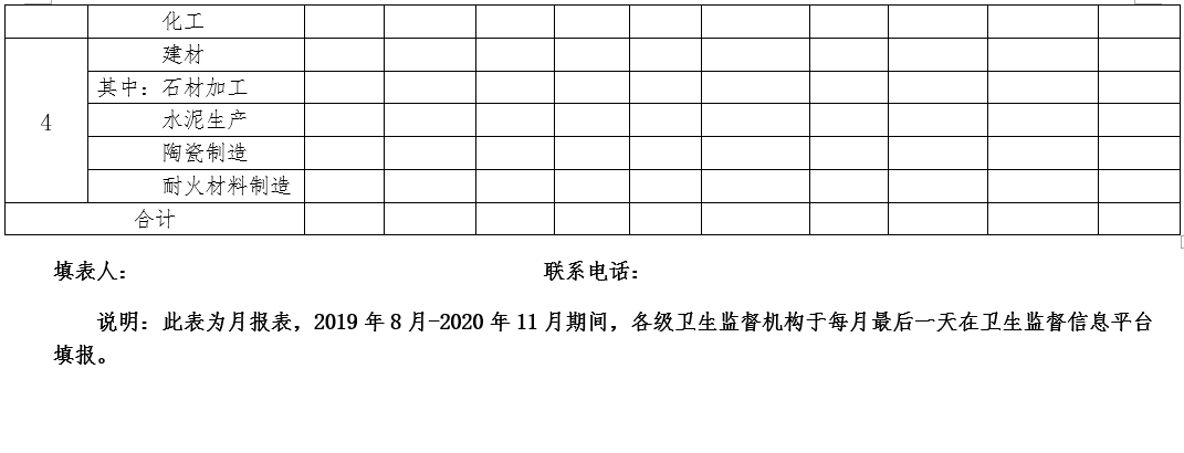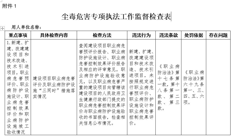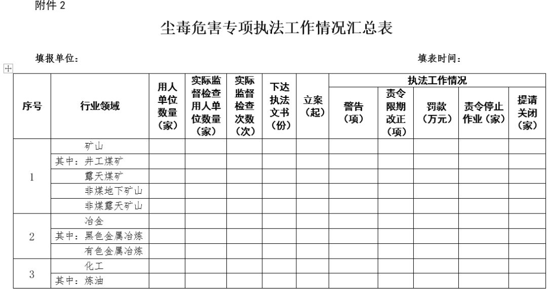 1.各地要根据406号文件要求明确治理重点和纳入治理范围的用人单位底数,依据《尘毒危害专项执法工作监督检查表》(见附件1)开展专项执法工作,严厉查处违法行为。纳入406号文件治理范围的矿山、冶金企业监督检查覆盖率要达到95%以上;纳入原安监部门职业危害申报系统的建材企业监督检查覆盖率要达到95%以上。集中整治阶段实行《尘毒危害专项执法工作情况汇总表》(见附件2)月报制度,各地于每月最后一天在卫生监督信息平台填报汇总表,国家卫生健康委监督中心负责建立网络信息报送渠道及信息汇总统计分析工作。