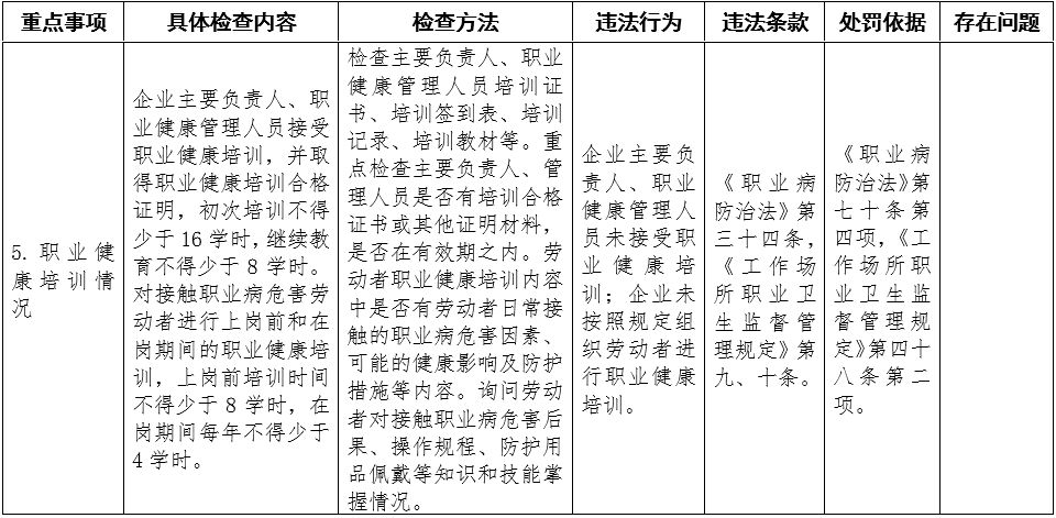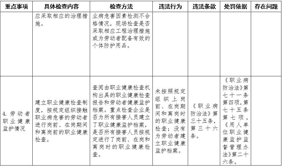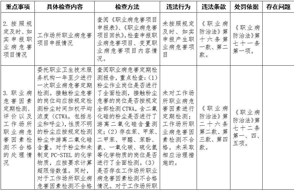 2.各地要加强对重点执法对象的监督检查,严肃查处各类案件,严厉打击违法行为。对于未依法开展职业病危害项目申报和职业健康检查的违法行为,在责令限期改正的同时视情节轻重并处相应罚款。对于未依法开展职业病防护设施“三同时”、职业病危害因素定期检测等违法行为,要责令限期改正。对于没有按照要求限期完成整改的用人单位,该处罚的要处罚,该停产的要停产,该纳入“黑名单”(注:如绿色信贷等)的要纳入“黑名单”管理。对于工艺落后、危害严重、整改无望的用人单位 ,要坚决提请地方人民政府依法予以关闭。