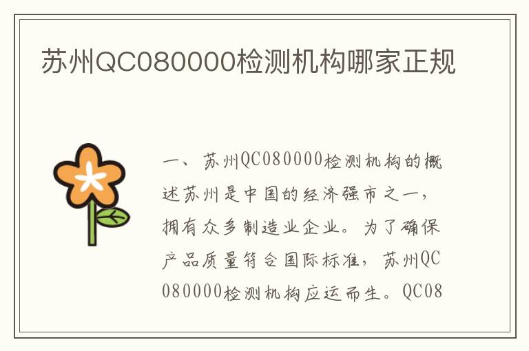 苏州是中国的经济强市之一,拥有众多制造业企业。为了确保产品质量符合国际标准,苏州QC080000检测机构应运而生。QC080000是一种产品环境管理体系标准,旨在帮助企业有效管理和控制产品环境相关问题。在苏州,有多家QC080000检测机构,但并非所有机构都正规可靠。本文将对苏州的正规QC080000检测机构进行介绍和评价。