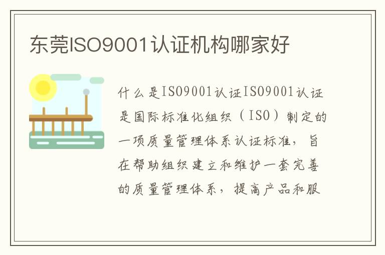 ISO9001认证是国际标准化组织(ISO)制定的一项质量管理体系认证标准,旨在帮助组织建立和维护一套完善的质量管理体系,提高产品和服务的质量,满足客户需求,并持续改进组织的运作。东莞作为中国制造业的重要基地,有众多企业需要进行ISO9001认证,选择一家好的认证机构至关重要。