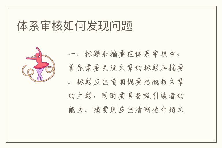 在体系审核中,首先需要关注文章的标题和摘要。标题应当简明扼要地概括文章的主题,同时要具备吸引读者的能力。摘要则应当清晰地介绍文章的主要内容和结论。在审核过程中,需要确保标题和摘要与文章的实际内容相符,避免夸大、误导或遗漏重要信息的情况。