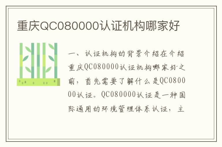 在介绍重庆QC080000认证机构哪家好之前,首先需要了解什么是QC080000认证。QC080000认证是一种国际通用的环境管理体系认证,主要用于指导和规范企业在生产过程中对环境保护的管理。重庆作为中国西南地区的经济中心,拥有众多的认证机构。以下将介绍几家在重庆具有较高声誉和专业能力的QC080000认证机构。