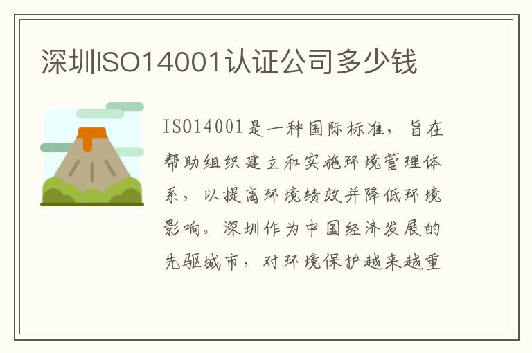 ISO14001是一种国际标准,旨在帮助组织建立和实施环境管理体系,以提高环境绩效并降低环境影响。深圳作为中国经济发展的先驱城市,对环境保护越来越重视。越来越多的企业开始寻求ISO14001认证,以展示其环境责任和可持续发展的承诺。那么,深圳ISO14001认证公司的收费标准是多少呢?本文将从多个方面进行详细阐述。