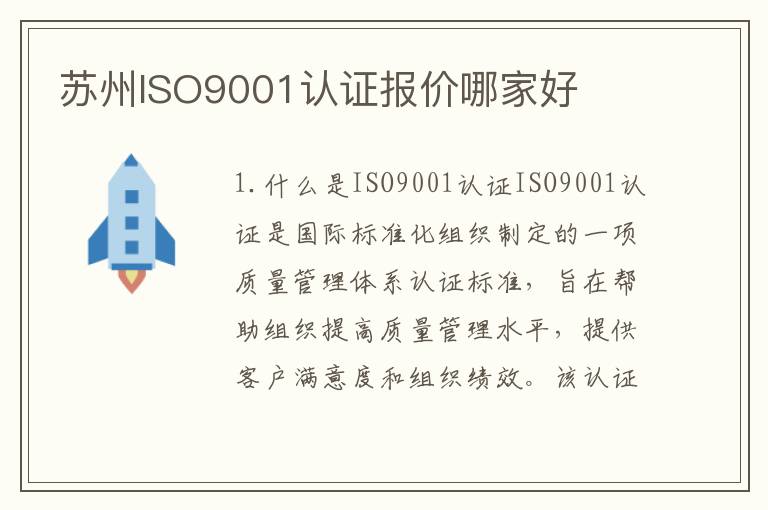 3. 苏州质量协会:该协会是苏州地区质量管理领域的权威机构,拥有丰富的资源和专业的团队,可以为组织提供专业的ISO9001认证服务。
