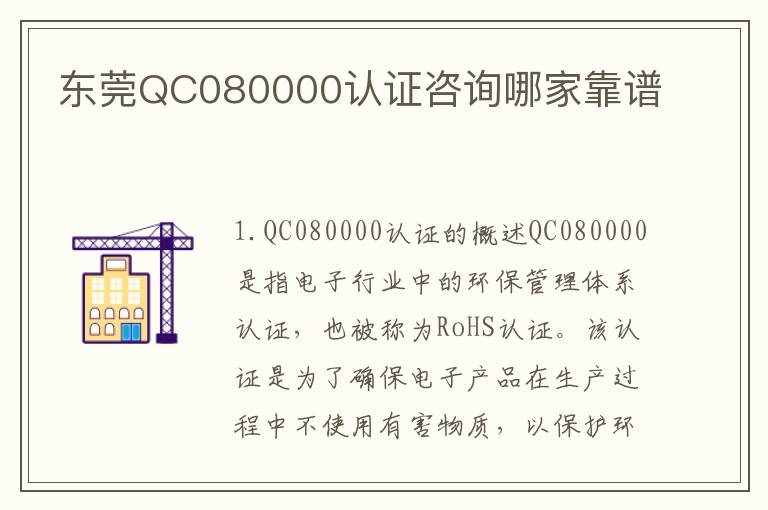QC080000是指电子行业中的环保管理体系认证,也被称为RoHS认证。该认证是为了确保电子产品在生产过程中不使用有害物质,以保护环境和人类健康。在东莞地区,有许多咨询公司提供QC080000认证咨询服务,但是选择一家靠谱的咨询公司并不容易。