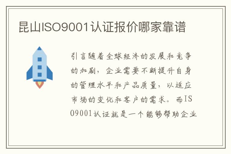 随着全球经济的发展和竞争的加剧,企业需要不断提升自身的管理水平和产品质量,以适应市场的变化和客户的需求。而ISO9001认证就是一个能够帮助企业实现这一目标的重要工具。昆山作为中国制造业的重要基地之一,众多企业也开始意识到ISO9001认证的重要性,并开始寻找靠谱的认证机构。本文将从多个方面对昆山ISO9001认证报价进行详细阐述,为企业提供参考。