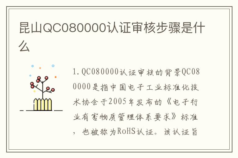 QC080000是指中国电子工业标准化技术协会于2005年发布的《电子行业有害物质管理体系要求》标准,也被称为RoHS认证。该认证旨在确保电子产品符合环保要求,不含有害物质。昆山作为中国电子产业的重要基地,对QC080000认证的审核步骤具有重要意义。