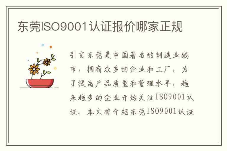 东莞是中国著名的制造业城市,拥有众多的企业和工厂。为了提高产品质量和管理水平,越来越多的企业开始关注ISO9001认证。本文将介绍东莞ISO9001认证的相关情况,并对几家正规的认证机构进行报价比较。