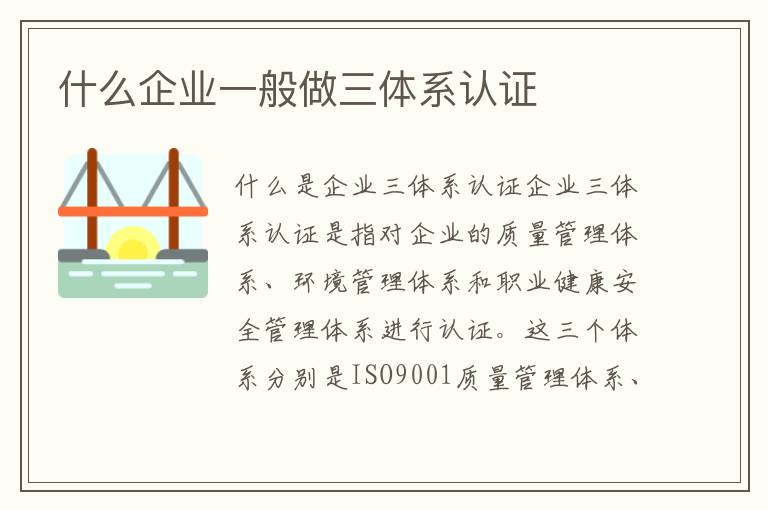 企业三体系认证是指对企业的质量管理体系、环境管理体系和职业健康安全管理体系进行认证。这三个体系分别是ISO 9001质量管理体系、ISO 14001环境管理体系和ISO 45001职业健康安全管理体系。企业通过三体系认证可以提高管理水平,增强竞争力,提升企业形象,符合国际标准,满足客户需求。