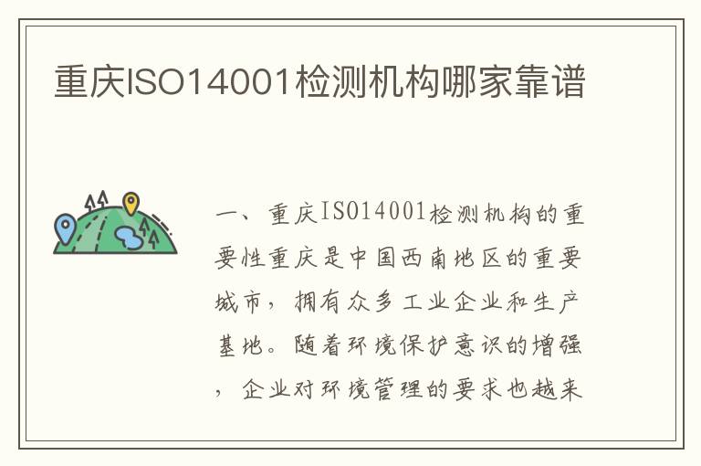 重庆是中国西南地区的重要城市,拥有众多工业企业和生产基地。随着环境保护意识的增强,企业对环境管理的要求也越来越高。ISO14001环境管理体系认证成为企业提升环境管理水平的重要手段。而重庆ISO14001检测机构的靠谱性则成为企业选择认证机构的关键因素。