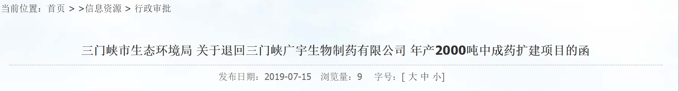 你公司报送的由河南省正德环保科技有限公司金超(职业资格证书编号0011352)编制的《三门峡广宇生物制药有限公司年产2000吨中成药扩建项目环境影响报告书(送审版)》(以下简称《报告书》)收悉。