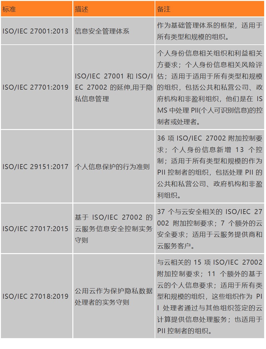 企业有效的信息安全管控及个人隐私处理,是为客户及用户带来信任和提升品牌价值的方法和策略;以下是有关个人信息、隐私保护、信息安全等管理体系对比表。