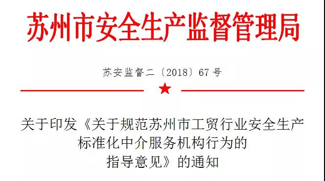 为营造公平、公正、有序竞争的安全生产中介技术服务市场环境,进一步规范工贸行业安全生产标准化中介服务机构(以下简称中介机构)服务行为和市场秩序,提高安全生产标准化中介机构服务水平,促进企业安全生产标准化工作持续改进,近日,苏州市安监局印发《关于规范苏州市工贸行业安全生产标准化中介服务机构行为的指导意见》。