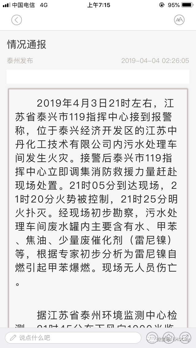 2019年4月3日21时左右,江苏省泰兴市119指挥中心接到报警称,位于泰兴经济开发区的江苏中丹化工技术有限公司内污水处理车间发生火灾。接警后泰兴市119指挥中心立即调集消防救援力量赶赴现场处置。21时05分到达现场,21时20分火势被控制,21时25分明火扑灭。经现场初步勘察,污水处理车间废水罐内主要含有水、甲苯、焦油、少量废催化剂(雷尼镍)等,根据专家初步分析为雷尼镍自燃引起甲苯爆燃。现场无人员伤亡。