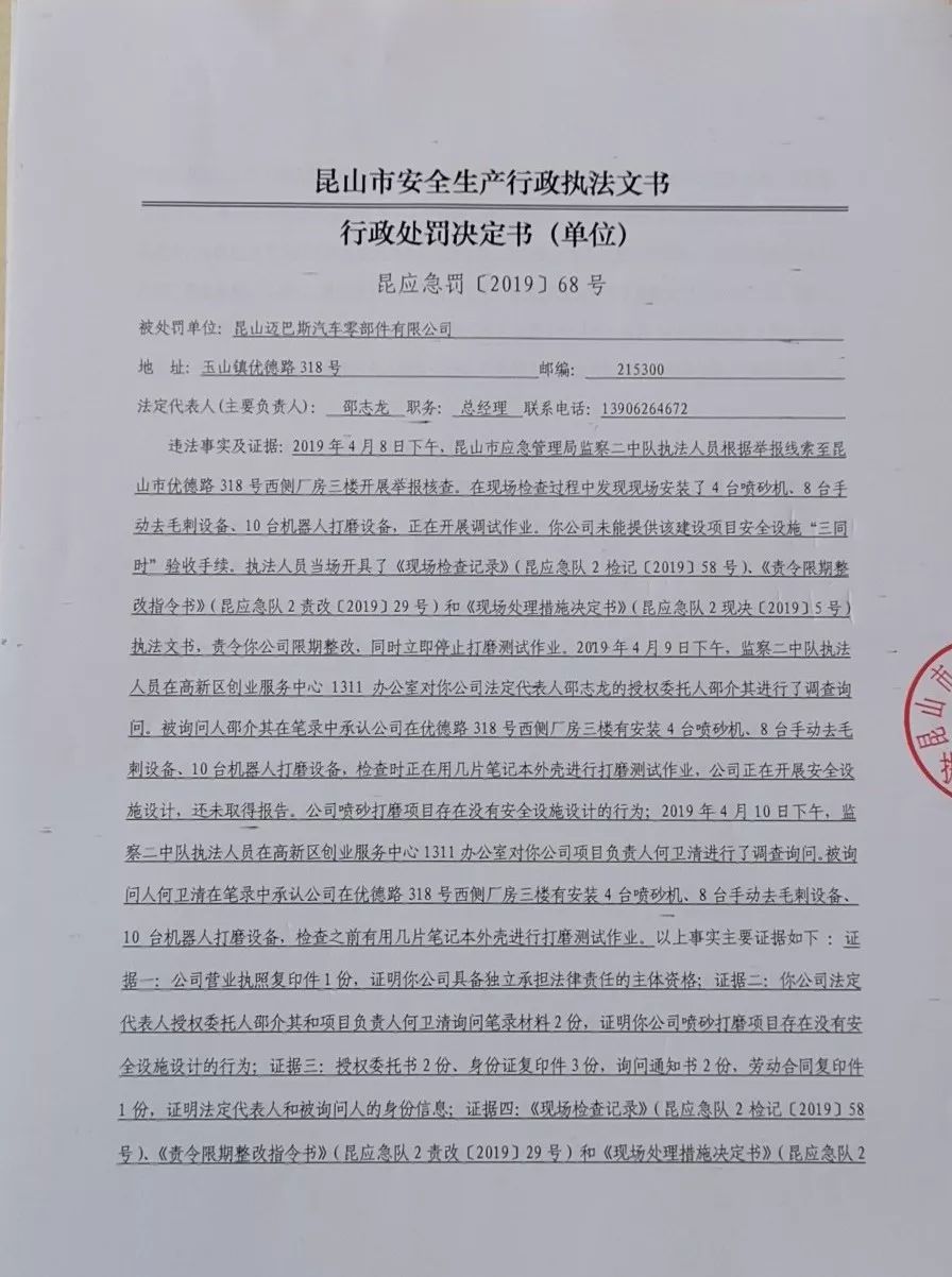 针对昆山迈巴斯汽车零部件有限公司喷砂打磨项目没有安全设施设计的违法行为,作出责令限期改正,处人民币壹万贰仟元整罚款的行政处罚。