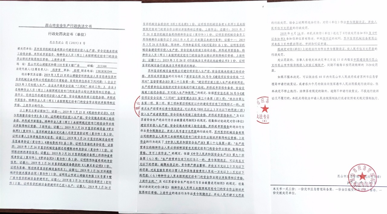 淀山湖镇安环所执法人员(以下简称“执法人员”)于2019年3月25日至显宗机械设备进行现场检查。检查当日,执法人员发现:1、显宗机械设备新建项目共计1台激光切割机、1台数控冲床、2台折弯机、2台剪板机和10台左右焊机,总投资金额为300万元,该新建项目有设置相关安全设施,但在该新建项目于2019年3月初投入生产之后,这些安全设施并没有进行竣工验收;2. 企业6名特种作业人员(焊工)未按照规定经专门的安全作业培训并取得相应资格,上岗作业。针对上述情况,执法人员立即开具了《责令限期整改指令书》,责令企业限期整改。