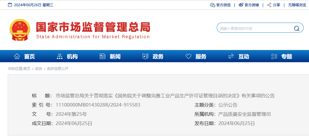 新公告发布!贯彻落实《国务院关于调整完善工业产品生产许可证管理目录的决定》有关事项的公告